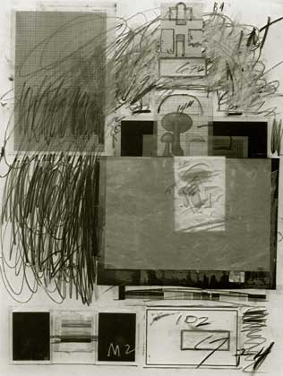 Franz Kline nagy "gerendavonásait" is kerüli, de totalitásukat (fogalmazzunk kurtán-durván) hasznosítja. Idézzük fel a további neveket: Newman, Still, Rothko, Reinhardt, Kooning, Pollock. Gondolom, Kellyhez nem sok köze lehetett. Más jegy. A fény nagyon fontos. Összesen ennyit lopok ki a grazi katalógusból. Az emberi közmegegyezés nem arcok, tájbomlások-fúlások formáiban mutatkozik, de számolócédulása, firkálmányosan. S így "maga a firka", az oda-vissza, oda-vissza már-már tárgyi. És már-már közlendõ (saját leleményem, remélem), hogy a tárgy nélküli firka jószerén ugyanannyit fejez ki, mint a szám és a betû, vagy fordítva. A festõi közlendõ szempontjából, mármint. És hozzá az alapozás. Ami mindent eldönt. Amitõl a szürke firka (például) majdnem plasztikus teret kap. Vagy egy-egy barnás-okkeres tetõre-zuhog-az-esõ rajza olyan, mintha inkább a tetõ terve lenne, szöveg van alatta, van a két kép-rész "köztes sávján". Evidensen tolul fel a szintén délvidékes Ben Nicholson, ám õ klasszikus konstruktivista még (ehhez képest/fakturásan bár).