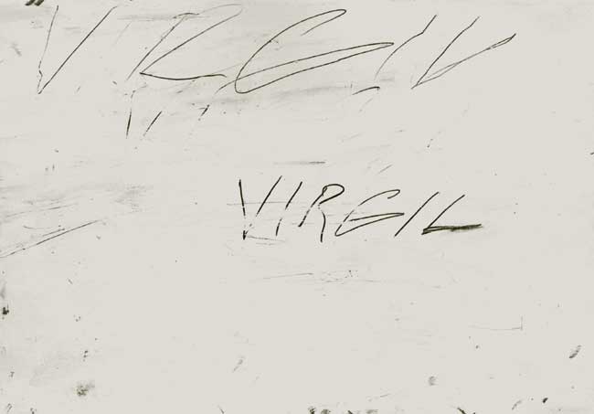 Edwin Parker Twombly, sz. Lexington (Virginia), Cy a legendás bézbóljátékos, Cy Young okán lesz. Furcsa véletlen: lexingtoni iskoláinak végeztével a georgia-i Rome-ban lesz növendék, aztán a bostoni Museum of Fine Arts tanulója. 1951-52: megismerkedik Rauschenberggel (valamit gyorsan: az a bõ fél évtized, amivel C.T., a továbbiakban csak így, Ellsworth Kellynél fiatalabb, döntõ). Nevezetes fordulta: Black Mountain College (sapienti...) Észak-Karolinában, a nálunk kevésbé ismert kiváló Ben Shan és a nagyon ismert Motherwell tanítványa. 1951: elsõ szólókiállítása Chicagóban. 1952: Rauschenberggel az E.Á. déli részén utazgat, Kubába látogatnak. Közös kiállításuk, Stable Gallery, New York, 1953. 1953-54: katonai szolgálat. 1955: már máig nevezetes képeinek születése. 1957: már második utazása Rómába (Itália). 1958: római kiállítás. Elsõ kereskedelmi siker, Milánó. 1960: Rómába költözik, nagyformátumú munkák, színesség, görögség, barokk (!). 1962-bõl (-re) datálja a grazi katalógus az új képformátumot: négyzet-alak, fakóbb, sápadtabb paletta. Szürke alapozású képei. (Maradandó jegy.) 1970-es fõmûvek (Cím nélkül). Nehéz is címeket adni C.T. képeihez. Leszámítva a késõbbi, egy-az-egyben klasszikus nevekbõl formáltakat. 1973-ban már berni retrospektív. 1979: Whitney Museum, úgyszintén. Szobrai Krefeldben (már ugyancsak retrospektív). Mindezt "szakszerû" értékelésének témájához (DuMont-könyv). Baden-Württenberg. És egyre Itália. Két ciklus: A Négy Évszak. 1994: New York, MoMA, retrospektív. Életrajza erõteljesebben szakmai. És Itália, Görögország. Fix nívó. Firkák. Az erõteljes vonal-oda-vissza, erõteljes alapozással. Nagy hangsúlya van a "szürkés" alap majdnem-monokrómjának. Ha a firkát "leemeljük" képzeletben, még leheletnyibb (kevesek kenyere? gúnnyal mondjuk), fizikai lényegisége ellenére intellektuálisnak is nevezhetõ. S nemcsak a zeneszerzõ John Cage, a poéta Charles Olson szellemközelsége (Black Mountain...) miatt. Remek szerencséje volt a kimagaslóan tehetséges C.T.-nek. A Nagy Absztr. Generáció(k) sorra gyakorlati vagy szellemi segítõi. A legnehezebb lehetett a Robert Motherwellel "szemben" kivívni szellemi függetlenségét. Ennek fizikai alapja lehet: C.T. nem kollázsos alkat.